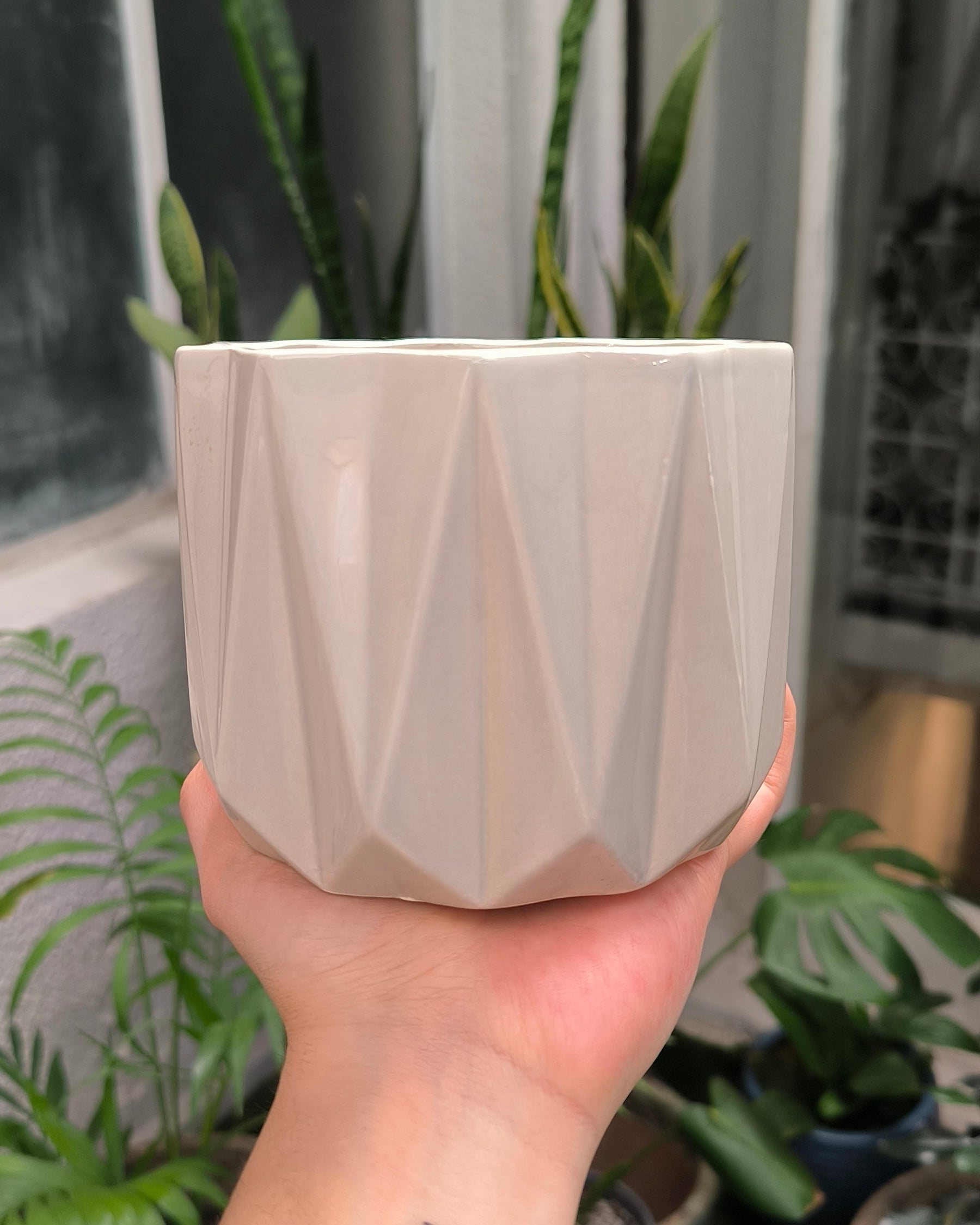 La Maceta de cerámica geométrica en gris claro es un accesorio decorativo de diseño moderno y elegante. Su superficie facetada crea un efecto tridimensional único que aporta textura y sofisticación a cualquier espacio. El tono gris claro, versátil y neutro, combina perfectamente con todo tipo de plantas y estilos de decoración, desde minimalista hasta contemporáneo.