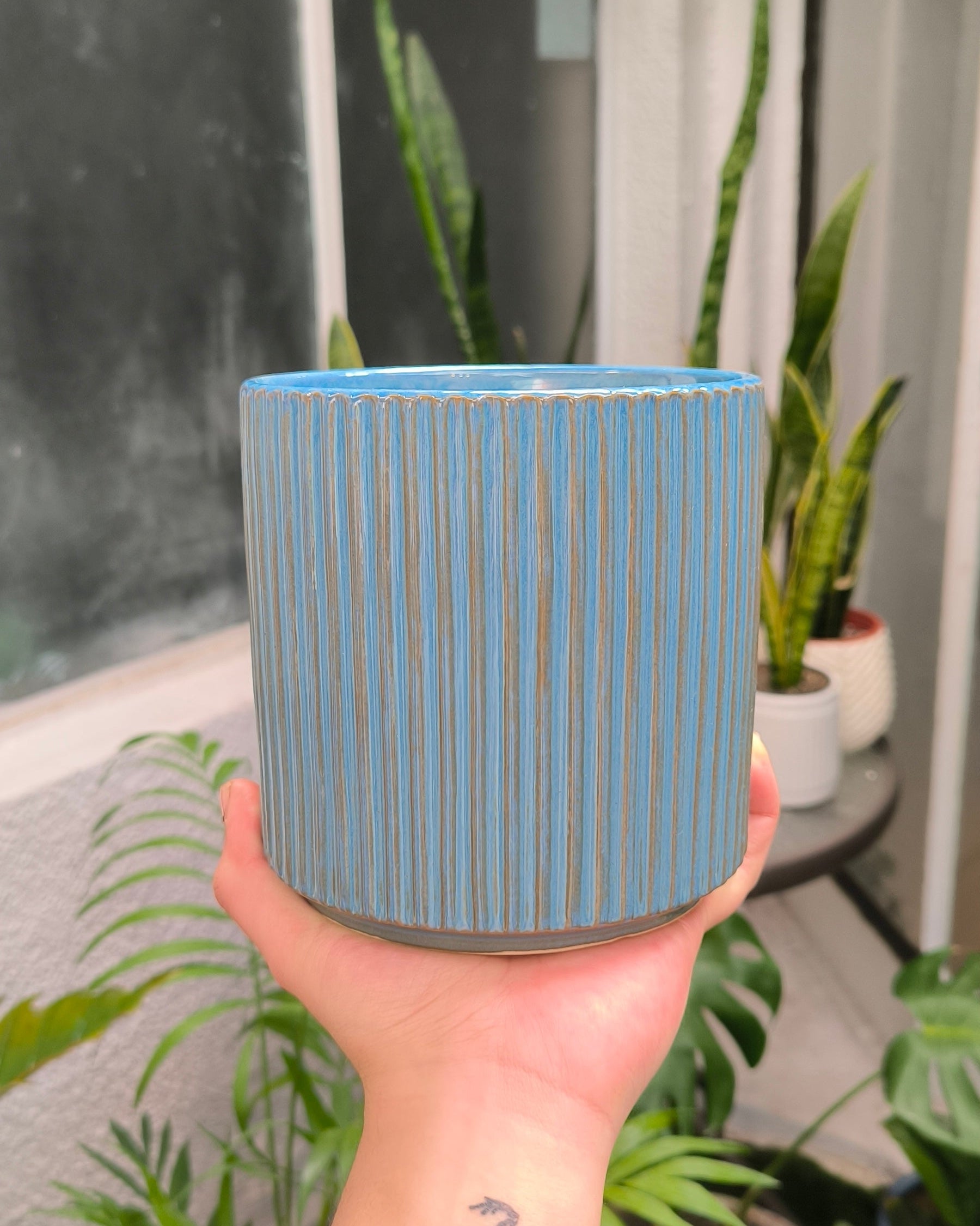 La Maceta de cerámica acanalada rústica en acabado azul envejecido es una pieza decorativa única que combina textura artesanal y estilo moderno. Su relieve vertical marcado y el efecto de pátina le dan un aspecto auténtico, ideal para quienes buscan un accesorio con personalidad que resalte en interiores o terrazas cubiertas.
