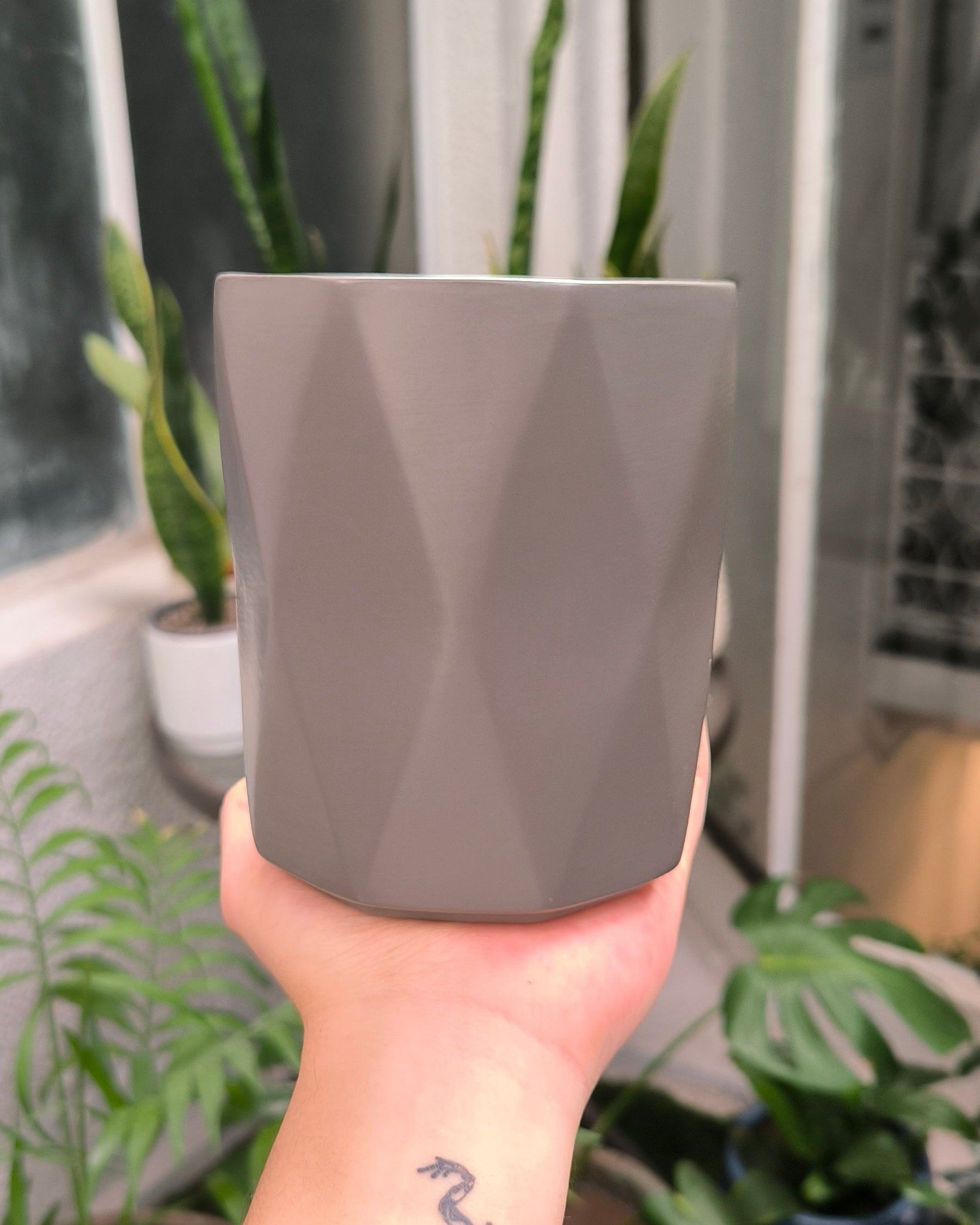 La Maceta de cerámica gris geométrica es un accesorio decorativo que combina diseño minimalista y elegancia contemporánea. Su acabado mate y su forma con facetas geométricas en relieve la convierten en una pieza versátil y sofisticada para resaltar cualquier planta de interior.