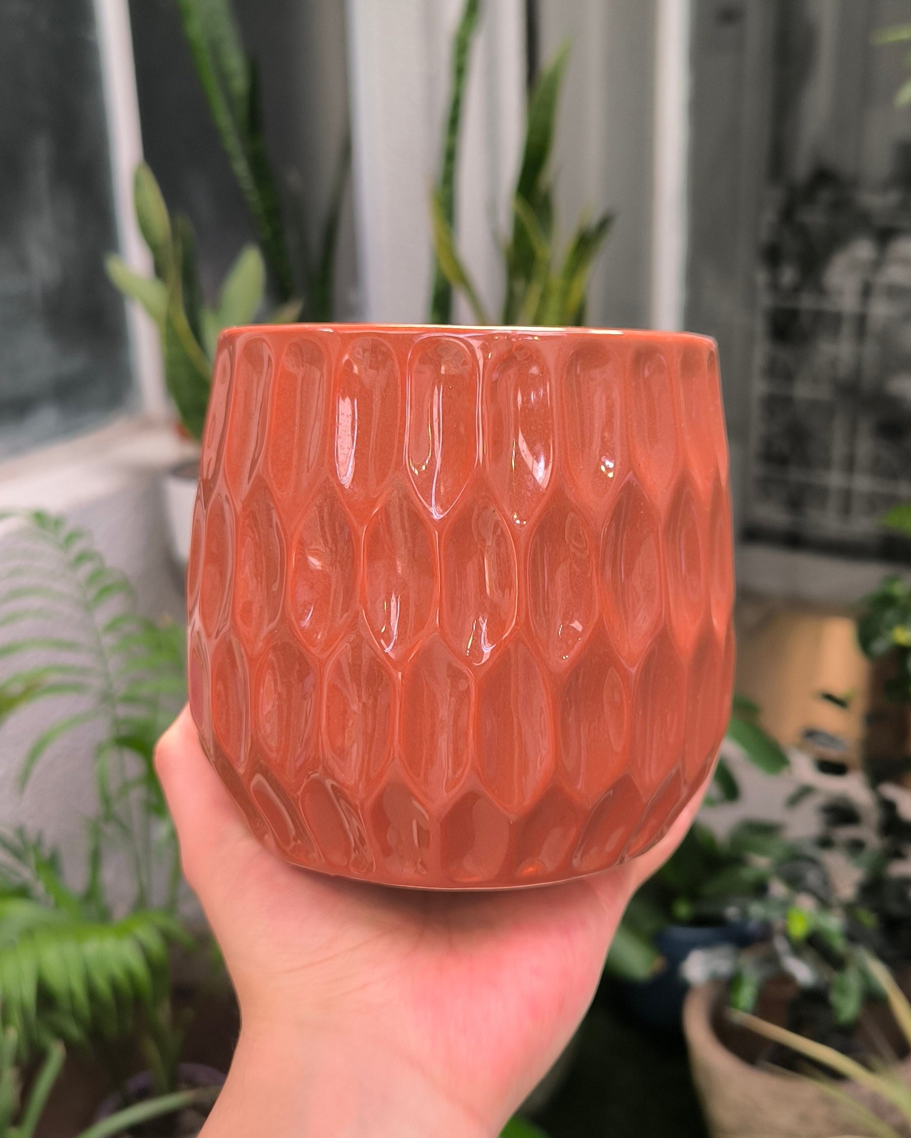 La Maceta de cerámica texturizada en relieve destaca por su diseño moderno con formas geométricas alargadas que generan un efecto tridimensional elegante y llamativo. Disponible en dos colores vibrantes y frescos: naranja y verde pastel, es perfecta para dar un toque alegre y contemporáneo a cualquier rincón de tu hogar.