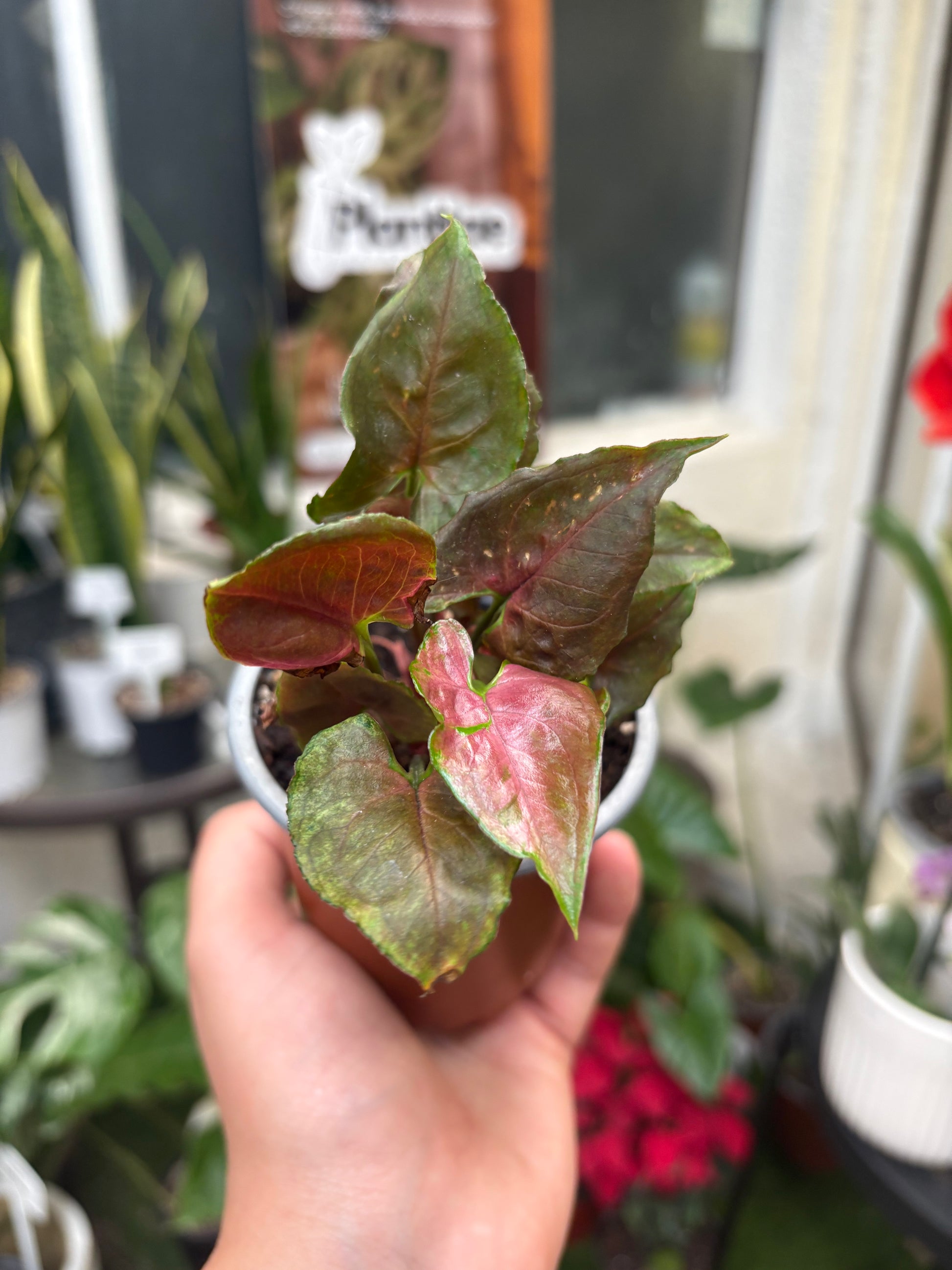 La Syngonium Berry Allusion es una variedad ornamental de follaje espectacular, conocida por sus hojas en forma de flecha con tonos verdes profundos, rosa y morado que cambian según la luz y la edad de la hoja. Cada ejemplar muestra un patrón único, convirtiéndola en una planta de colección imprescindible para los amantes de las aroides.