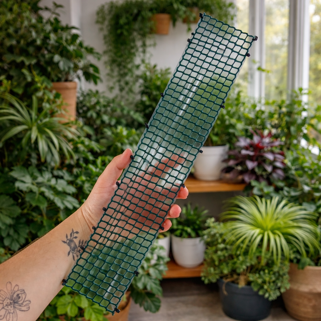 Su diseño semicilíndrico permite acompañar el desarrollo de tallos y raíces aéreas, ayudando a mantener una forma más ordenada y favoreciendo un crecimiento mejor dirigido. Es una muy buena opción para monsteras, philodendrons, pothos, singonios y otras plantas que agradecen soporte en maceta.
